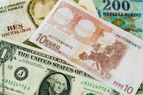 Various Banknotes 1 Us Dollar 10 Euro 200 Hungarian Forints Turkish Lira Buy This Stock Photo And Explore Similar Images At Adobe Stock Adobe Stock