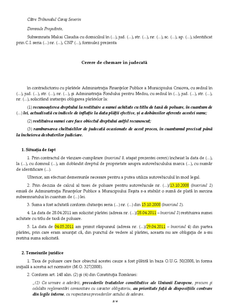 Cerere De Chemare In Judecata Pentru Restituirea Taxei De Poluare Template