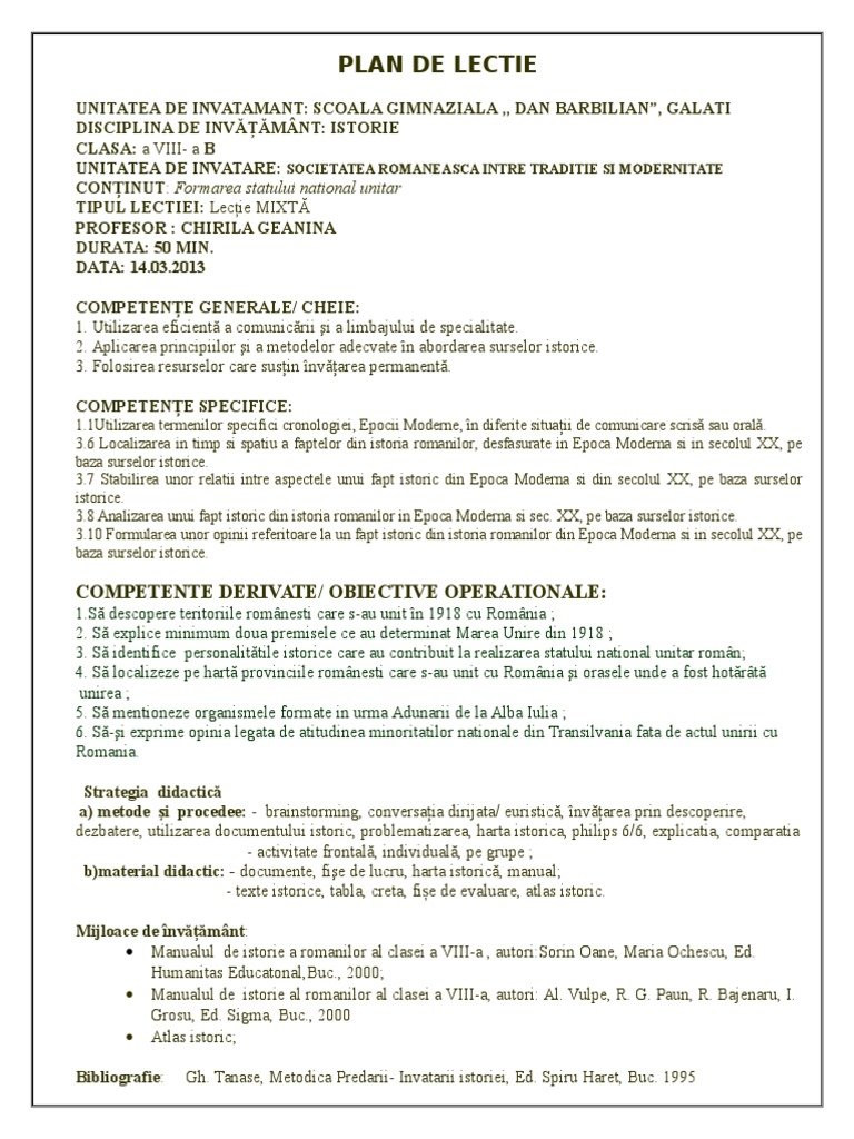 Plan De Lectie Competente Derivate Obiective Operationale