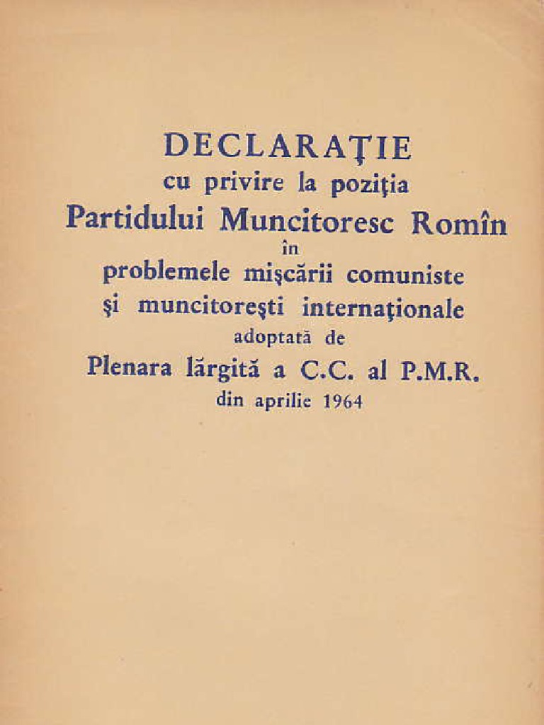 Declaratie Cu Privire La Pozitia Partidului Muncitoresc Romin In Problemele Miscarii Comuniste Si Muncitoresti Internationale Adoptata De Plenara Largita A C C Al P M R Din Aprilie 1964