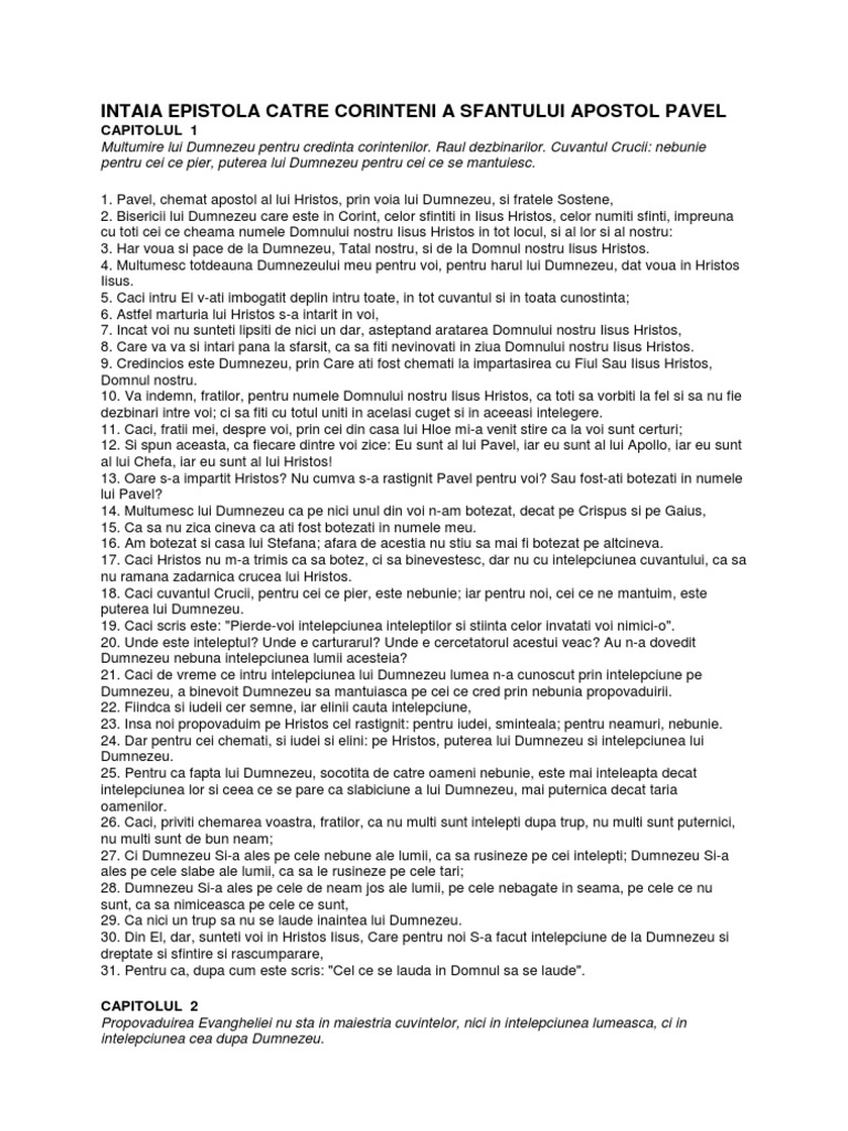 Fiţi următori ai mei precum şi eu sunt al lui hristos. 1 pavel chemat să fie apostol al lui isus hristos prin voia lui dumnezeu şi fratele sosten rom 1 1 2 cor 1 1 efes 1 1 col 1 1 fapte 18 17 2 către biserica lui dumnezeu care este în corint către cei ce au fost sfinţiţi în hristos isus chemaţi să fie sfinţi şi către toţi cei ce cheamă. Epistola întâia către corinteni a sfântului apostol pavel capitolul 13 dragostea şi bunurile ei. Hristos puterea si intelepciunea lui dumnezeu.
