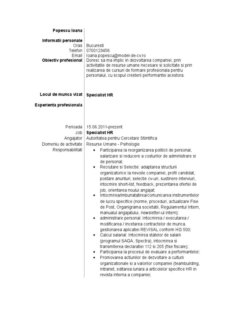 Model De Cv Specialist Hr