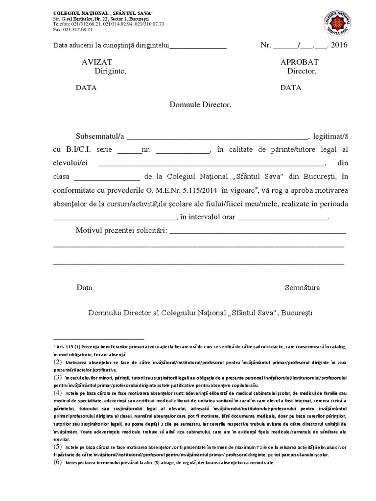 Model De Cerere Catre Director Pentru Motivarea Absentelor