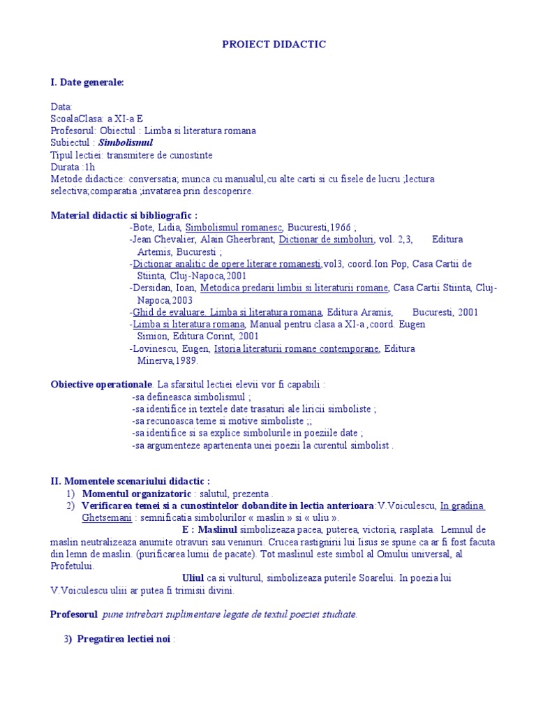 Proiect Didactic Simbolismul